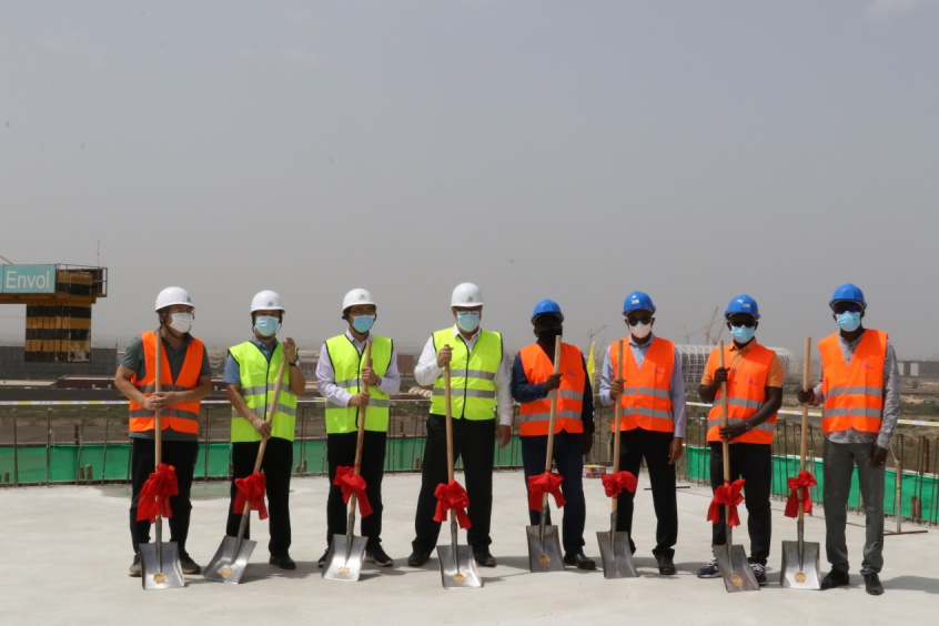 Le 15 juillet 2021 à 11h38, avec la dernière injection de béton sur la toiture de l'étage R+7 de la zone 2 du batiment C, la mise en place du couronnement du projet de batiment de bureau de l'Organisation des Nations Unies au Sénégal a été effectuée favorablement. Les pétards ont éclaté ensemble sur site du projet avec la salve d'applaudissements, les acclamations des employés chinois et sénégalais duraient longtemps. Le Président du conseil d'administration et le Président-directeur général de la Société ZHANG Shicheng, le Président du conseil d'administration TALL et le Directeur général Thiam du partenaire, le Directeur général adjoint de SZTC en Afrique de l’Ouest SUN Jianli, le Directeur général adjoint de SZTC au Sénégal QI Pan, le Directeur d'équipe de projet HAN Shaobo et tous les membres de l'équipe de projet ont participé à la cérémonie de mise en place du couronnement.