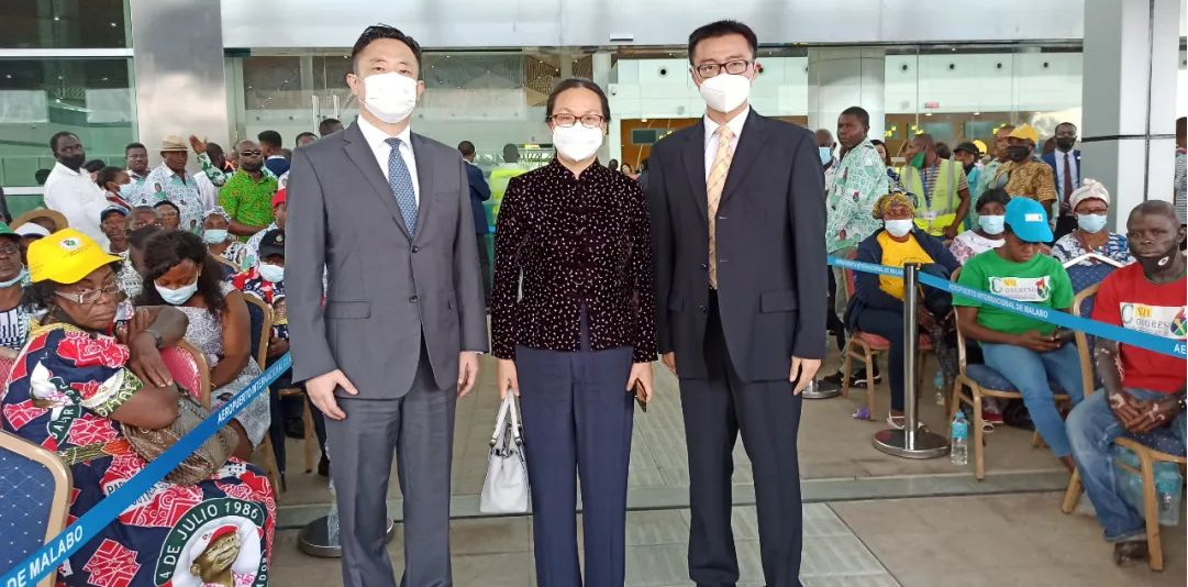L'ambassadrice Qi Mei (au milieu) inspecte le projet de l'aéroport international de Malabo